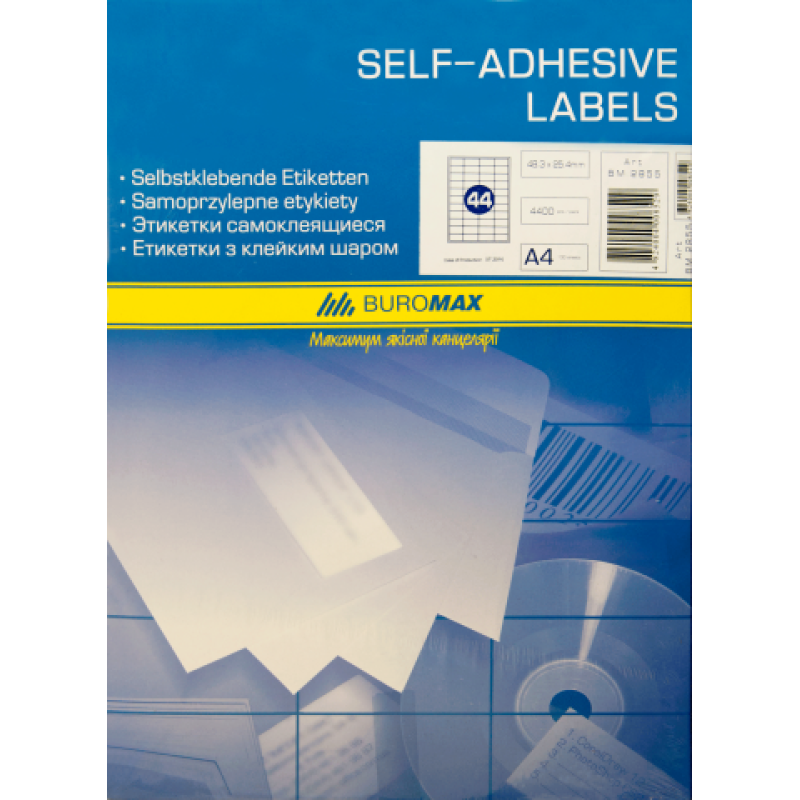 Самоклеящиеся этикетки Buromax — универсальные этикетки для использования на лазерных, струйных принтерах и копировальных аппаратах. Применяется для адресной наклейки на конверты, наклейки текстовой информации на товары, штрих-коды, ценники, предупреждения и т.д. Во время печати этикеток в настройках принтера выбирите тип бумаги — этикетка. Самоклеющиеся этикетки Buromax на листах А4 это удобный инструмент для нанесения необходимой информации (маркировки). Этикетку в основном используют для: маркировки любого вида продукции (для нанесения штрих-кода т.д.) нанесения графической, текстовой и другой информации (объявлений, перевода на другой язык, дополнительной информации о товаре и т.д.) товара и складского сервиса (магазины, торговые центры, складские комплексы) для почтовой рассылки (на бандероли, посылки, конверты и т.д.) для архивирования документов и делопроизводства (на картотеки, папки и т. д.) использования в домашних условиях для маркировки коробок с вещами и т.д.