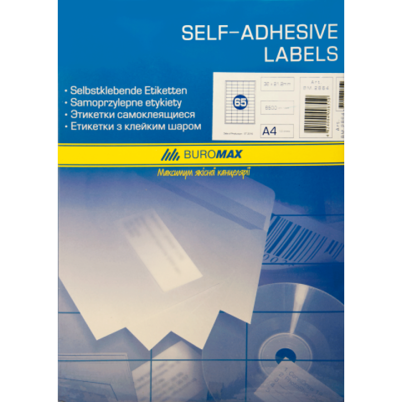 Самоклеящиеся этикетки Buromax — универсальные этикетки для использования на лазерных, струйных принтерах и копировальных аппаратах. Применяется для адресной наклейки на конверты, наклейки текстовой информации на товары, штрих-коды, ценники, предупреждения и т.д. Во время печати этикеток в настройках принтера выбирите тип бумаги — этикетка.