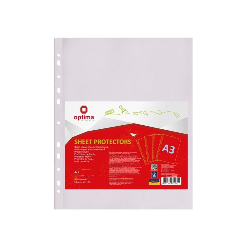 Теги: Файл для документов А3 Optima, 40 мкм, вертикальный, фактура "глянец" (50 шт / уп)