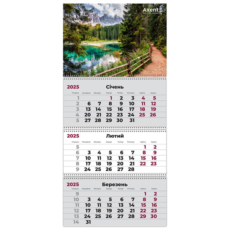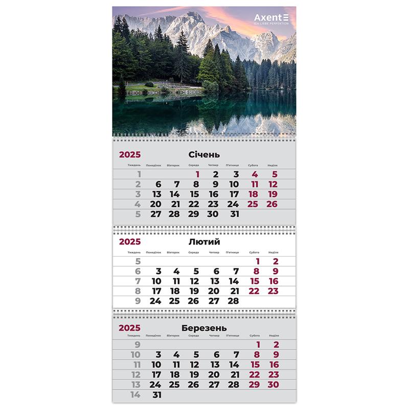 Календарь Axent на 2026  год • Настенный квартальный календарь на 3 пружины • Размер изделия 297*630 мм • Размер постера 297*210 мм, изготовлен из высококачественного картона • Размер блоков 297*140 мм, изготовленные из мелованной бумаги • Календарная сетка на украинском языке • Указатель дат с бегунком и отверстие для крепления • Каждый календарь в индивидуальной упаковке