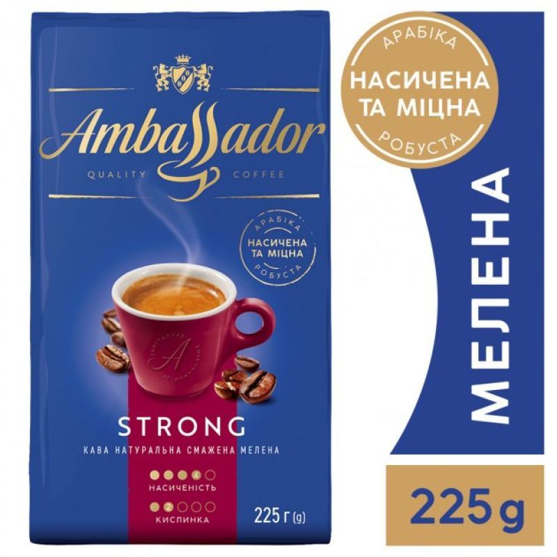 Ambassador Strong - композиція зерен темної обсмажування з виразним смаком та нотками темного шоколаду, прянощів, горіхів та медової насолоди. Арабіка наповнює кавовий букет ароматом, тоді як робуста робить напій повнотілим та кремовим. Відмінно підходить для приготування насиченого еспресо та чудово підходить у поєднанні з молоком. Вигляд: мелений. Обсмаження: темне Тип кави: арабіка/робуста Смаки: темний шоколад, горіхи, прянощі, мед Упаковка: вакуумне пакування. Країна виробник кави: Польща Термін придатності: 18 місяців Вага: 225 гр.