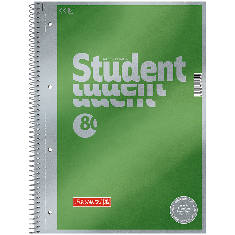 Колледж-блок BRUNNEN Premium А5 формата на спирали изготовлен из европейской высококачественной белой бумаги 90 г/м2. Имеет 80 листов нелинованных. Бумага устойчива к чернилам. Страницы с микроперфорацией для легкого отрывания. Дополнительная перфорация на 6 отверстий для крепления в папках. Лаконичный дизайн обложки в одном цвете. Характеристики: • Количество листов: 80. • Плотность: 90 г/м2. • Перфорация: 6 отверстий. • Линовка: нелинованный. • Цвет: изысканный зеленый с металлическим эффектом..