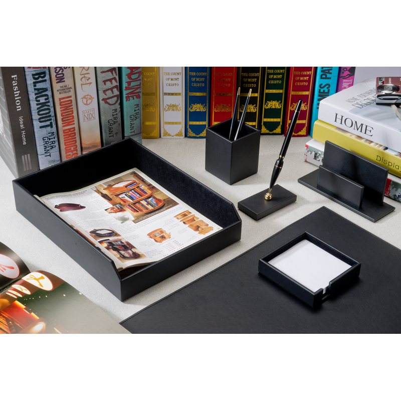 Bestar постоянно совершенствует свою продукцию, основываясь на четырех главных принципах: природа, искусство, функциональность, качество. Это одни из лучших настольных аксессуаров из натурального дерева и других материалов. Храните Ваши настольные принадлежности в этих уникальных и функциональных наборах. Это must-have для каждого современного, успешного человека. Этот настольный набор из исскуственной кожи содержит шесть предметов: настольный лоток для бумаг, подставки для карандашей, бокс для заметок, подставку для писем и подложку для письма.