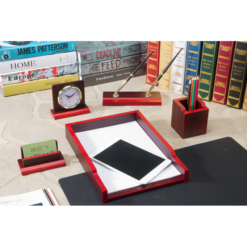 Bestar постоянно совершенствует свою продукцию, основываясь на четырех главных принципах: природа, искусство, функциональность, качество. Это одни из лучших настольных аксессуаров из натурального дерева и других материалов. Храните Ваши настольные принадлежности в этих уникальных и функциональных наборах. Это must-have для каждого современного, успешного человека. Настольный набор состоит из настольного лотка для бумаг, подставки для карандашей, подставки для визиток, подставки для ручек, настольных часов, подложки для письма.