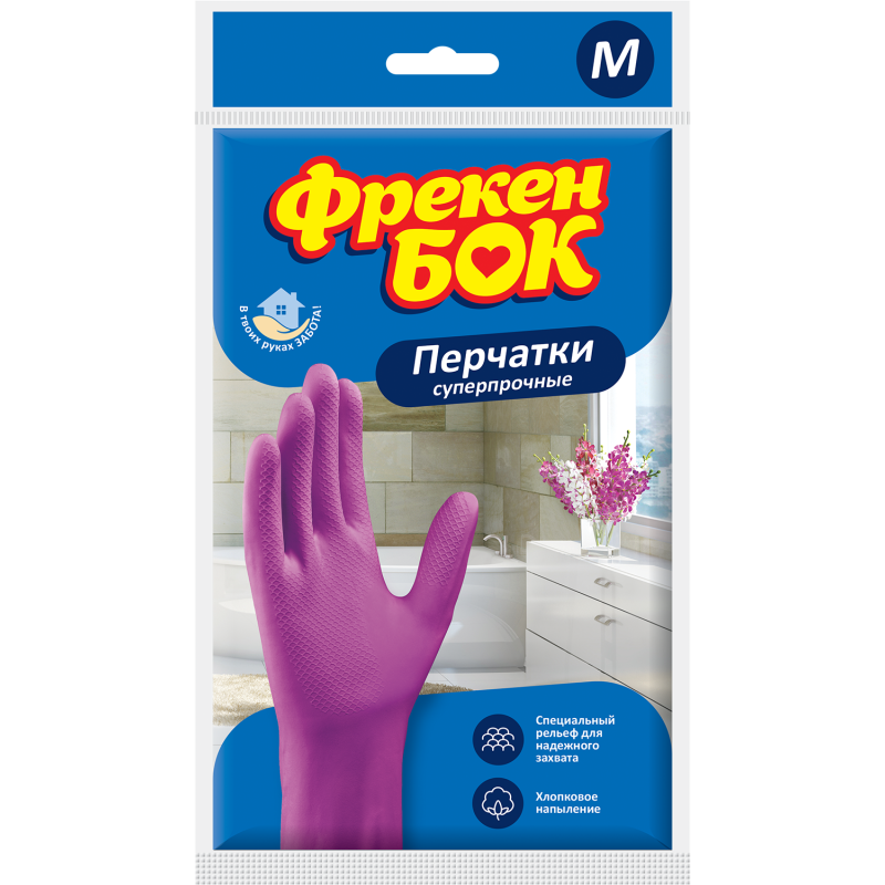 Универсальные суперпрочные перчатки торговой марки Фрекен БОК обеспечивают максимальный комфорт и удобство во время различных хозяйственных работ. Перчатки имеют внутреннее хлопковое напыление, которое снижает вероятность возникновения аллергической реакции. Высокая плотность перчаток позволяет выполнять любые хозяйственные работы, обеспечивая максимальную защиту и комфорт. Особенности: Надежный обхват руки. Имеют длительный срок службы благодаря увеличенной прочности. Хлопковое напыление.