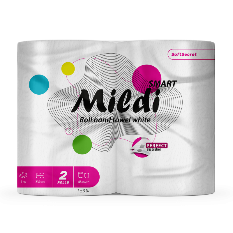 Двухслойное полотенце бумажное Mildi Smart изготовлено из 100% целлюлозы, имеет тиснение с ламинацией и перфорацией. Фасуется по 2 рулона. Диаметр рулона 110мм. Количество отрывных листов-56 шт., размер листа-230*210мм