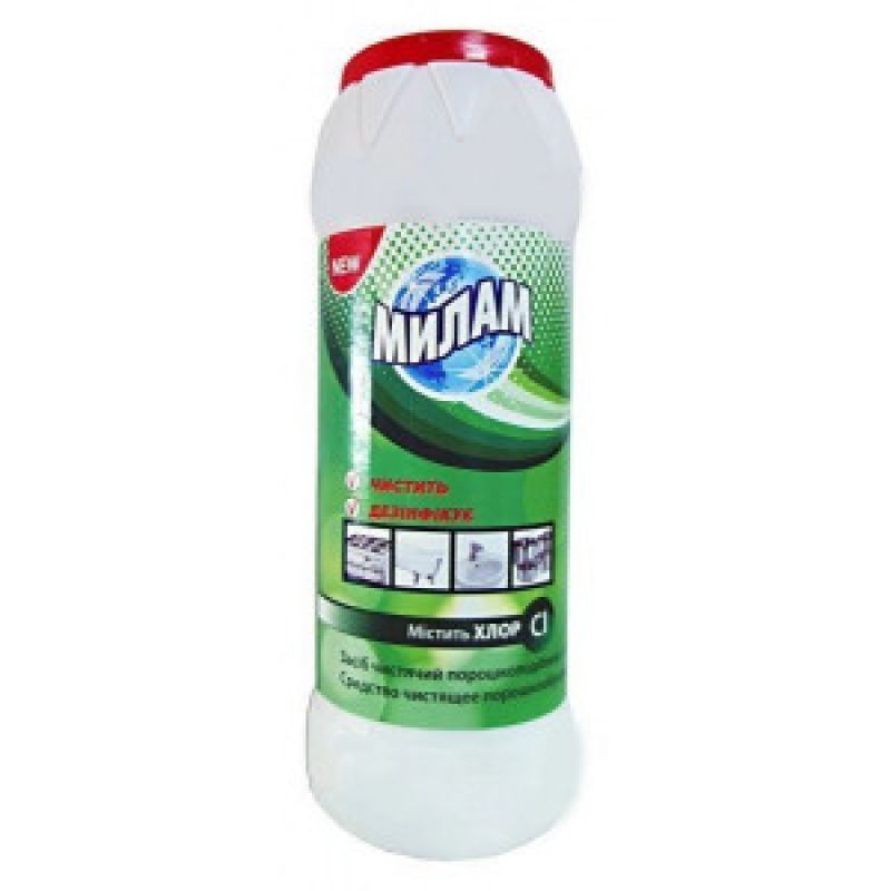 Чистящее средство ТМ “Милам” с хлором эффективно удаляет загрязнения различного происхождения, которые имеют пигментный, жировой, белковый, и углеводный характер, а также известковый налет, следы ржавчины и тому подобное.