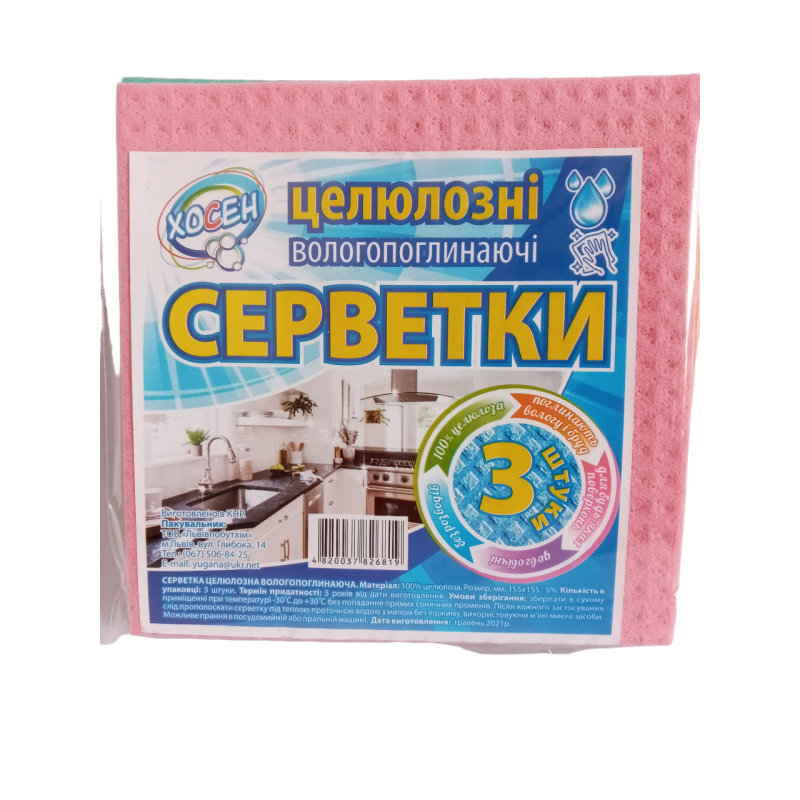 Серветки целюлозні 3шт. Серветки вологопоглинаючі. Розмір 15,5*15,5 см. Матеріал: 100% целюлоза. Застосування: для прибирання у домі. Добре поглинають вологу і бруд.