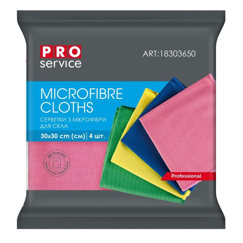 Серветки PRO service з мікрофібри для скла мають спеціальну гладку поверхню і призначені для протирання і полірування скляних, дзеркальних і хромованих поверхонь, елементів меблів, декору та сантехніки, особливо вибагливих до зовнішнього вигляду, наявності прозорості і блиску. Оптимально підібрана щільність 250 г/м.кв. і розмір 30х30 см дозволяють досягти максимального ефекту при прибиранні. Властивості матеріалу забезпечують доступ мікрофібри в найдрібніші пори і тріщини поверхні, що очищається. Серветки не залишають розводів і ворсу, дозволяють проводити прибирання без застосування миючих засобів. Серветки рекомендується прати вручну або в автоматичній пральній машині при температурі не більше 60 С. Не рекомендується сушити на обігрівальних приладах