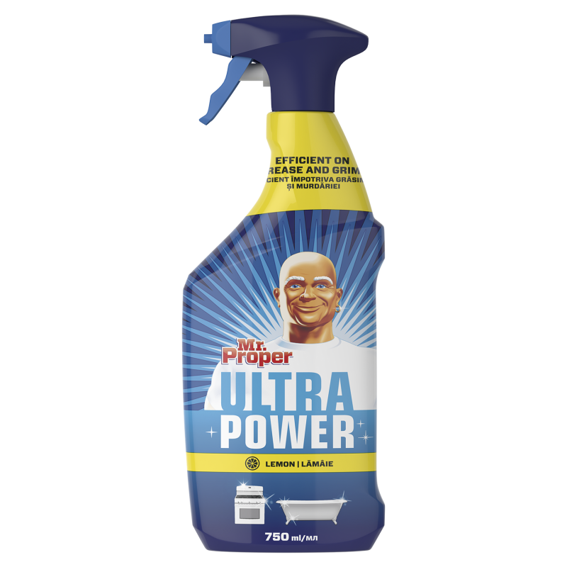 Универсальный спрей для чистки Mr Proper Ultra Power Лимон удаляет до 100% пыли, жира и грязи (протестировано на самых распространенных поверхностях и типах загрязнений).Благодаря своей сбалансированной формуле спрей идеально подходит для использования на кухне, в ванной комнате и почти на всех видах твердых поверхностей в доме. Он эффективно справляется со стойкими жирными пятнами на нержавеющей стали, устраняет загрязнения с кухонных раковин и очищает рабочие поверхности вдвое быстрее. Полную инструкцию по применению смотрите на упаковке. После использования средства следует тщательно промыть водой поверхности, которые непосредственно контактируют с пищей. Удаляет до 100% пыли, жира и грязи Спрей для чистки различных видов поверхностей Ultra Power Подходит для кухни и ванной комнаты Безопасный и эффективный способ для чистки большинства поверхностей (не использовать на необработанных деревянных поверхностях) Емкость:750мл