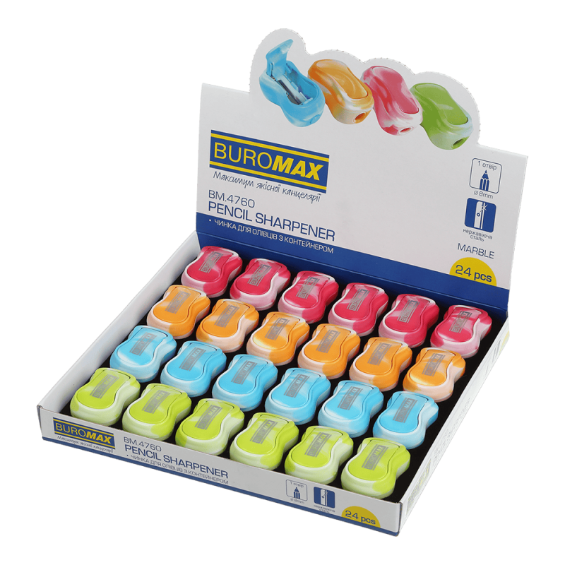 Точилка для карандашей MARBLE от BUROMAX – незаменимый инструмент для заточки карандашей стандартного диаметра. Оригинальный стильный дизайн с мраморным узором и яркие цвета – такая точилка пригодится офисным работникам, студентам и школьникам и станет симпатичным аксессуаром в рабочей зоне.