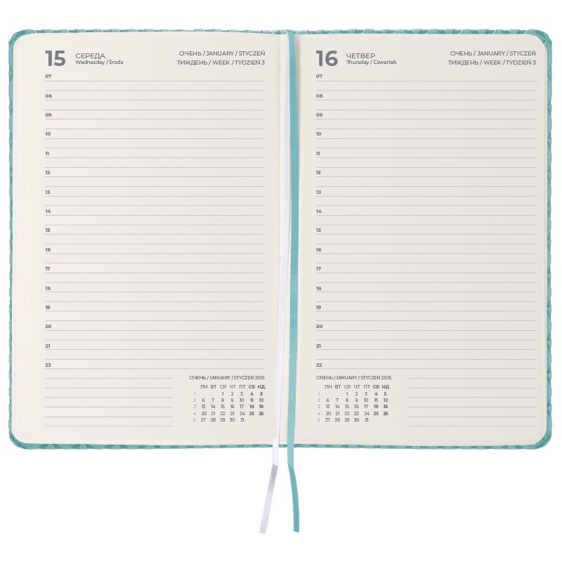Удобный ежедневник Axent из серии Partner Gently в твердой обложке. Используется для каждодневных записей, а также деловых и творческих задач. Твердая обложка помогает сохранить аккуратный и презентабельный вид на протяжении долгого времени. Качественная кремовая бумага плотностью 80 г/м2 хорошо впитывает чернила и обеспечивает комфортное письмо. Удобно делать записи, чертить и рисовать. Ежедневник имеет датированный блок в линию на каждый день. Внутренний блок на украинском языке. Блокнот содержит календарь на 2025-2026 год, общее расписание недели, поля для записи любимых книг, трекер полезных привычек, информацию о праздниках, важных телефонных номерах, часовых поясах стран мира, единицах измерения, шкале температур. Две разноцветные закладки-ляссе позволяют быстро найти и открыть нужные страницы. Содержит 184 листов, размер - 145*210 мм.