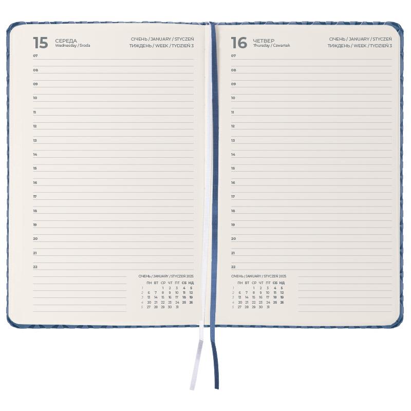 Удобный ежедневник Axent из серии Partner Gently в твердой обложке. Используется для каждодневных записей, а также деловых и творческих задач. Твердая обложка помогает сохранить аккуратный и презентабельный вид на протяжении долгого времени. Качественная кремовая бумага плотностью 80 г/м2 хорошо впитывает чернила и обеспечивает комфортное письмо. Удобно делать записи, чертить и рисовать. Ежедневник имеет датированный блок в линию на каждый день. Внутренний блок на украинском языке. Блокнот содержит календарь на 2025-2026 год, общее расписание недели, поля для записи любимых книг, трекер полезных привычек, информацию о праздниках, важных телефонных номерах, часовых поясах стран мира, единицах измерения, шкале температур. Две разноцветные закладки-ляссе позволяют быстро найти и открыть нужные страницы. Содержит 184 листов, размер - 145*210 мм.